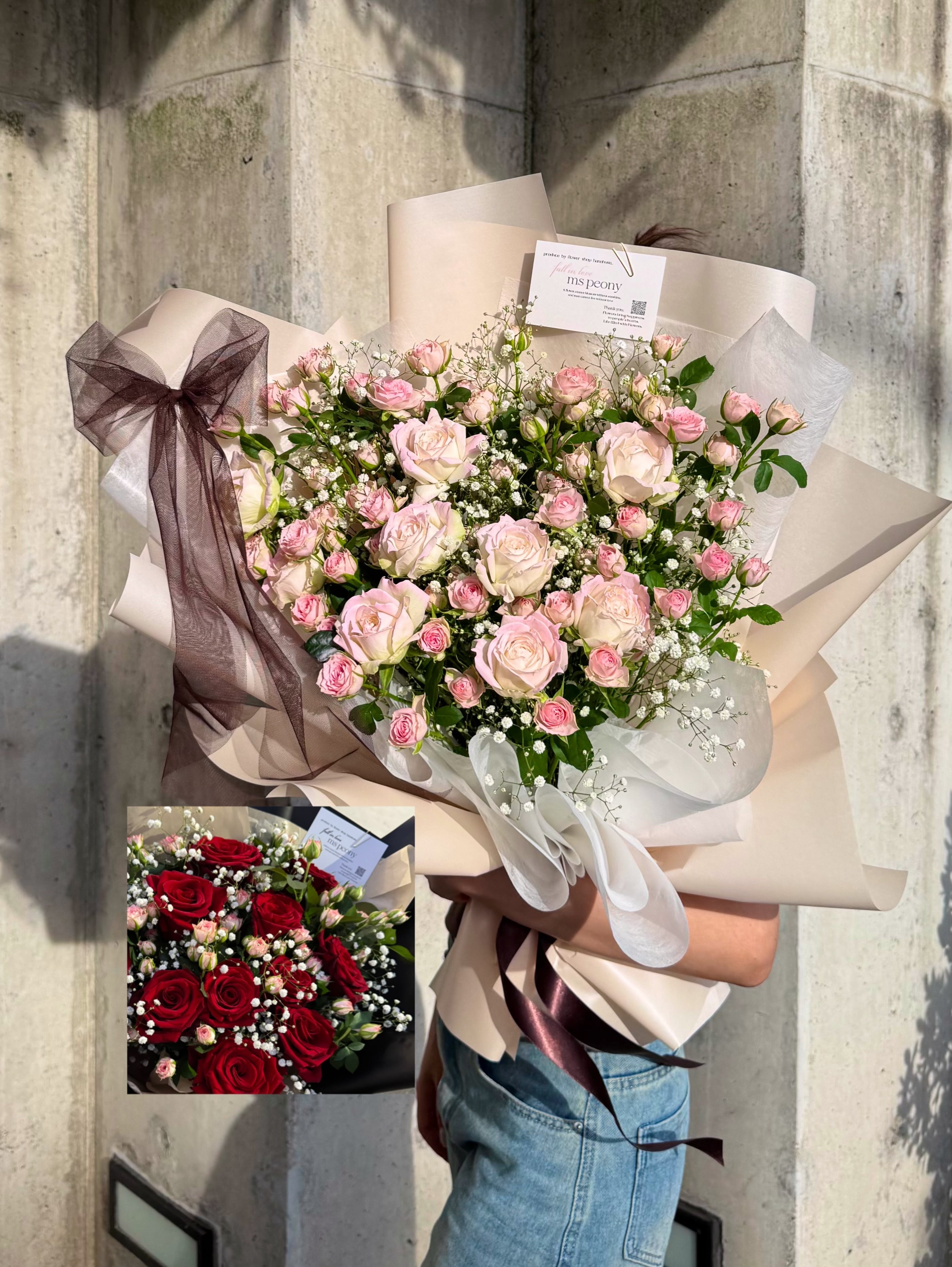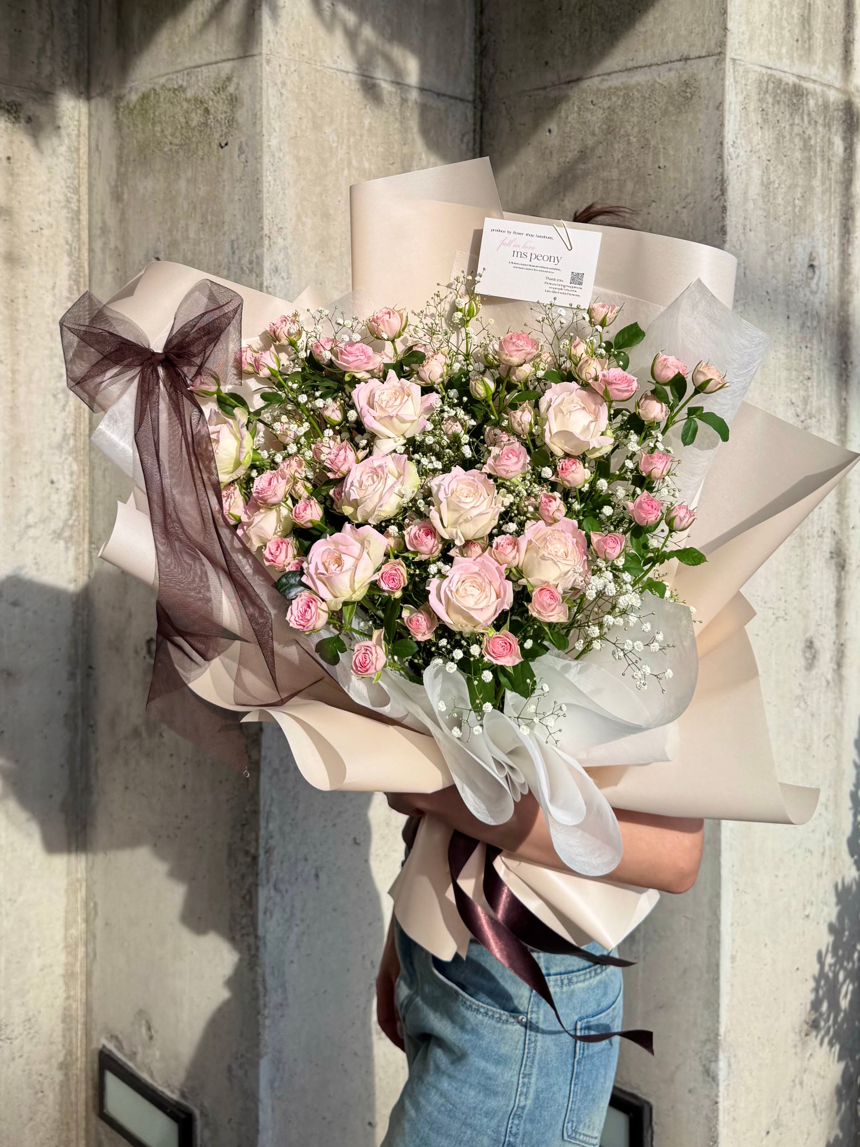 スプレーバラとスタンダードローズを贅沢に束ね、かすみ草をたくさん使用した、映えを作るMs Peonyオリジナルブーケをご用意いたしました♡