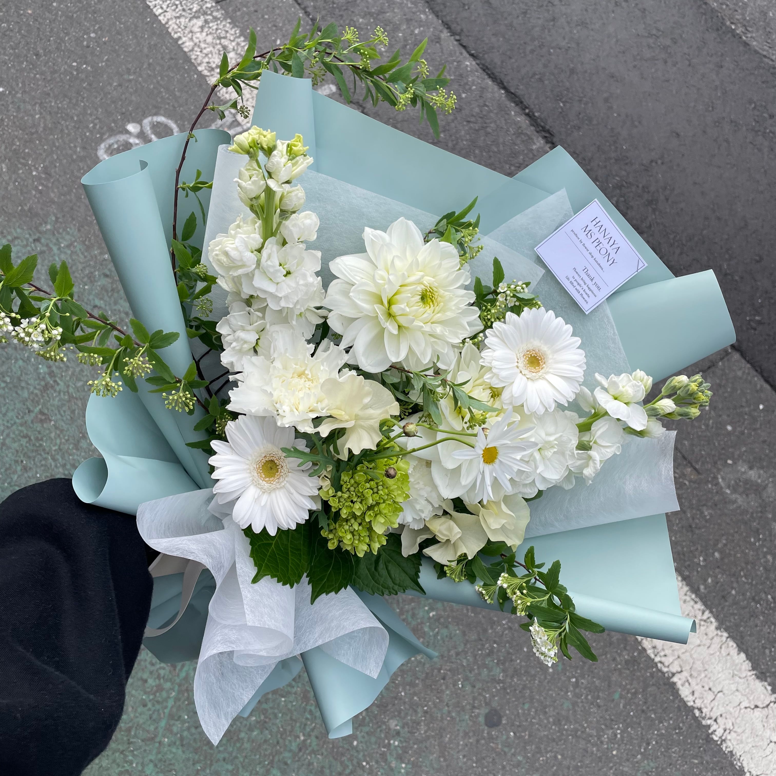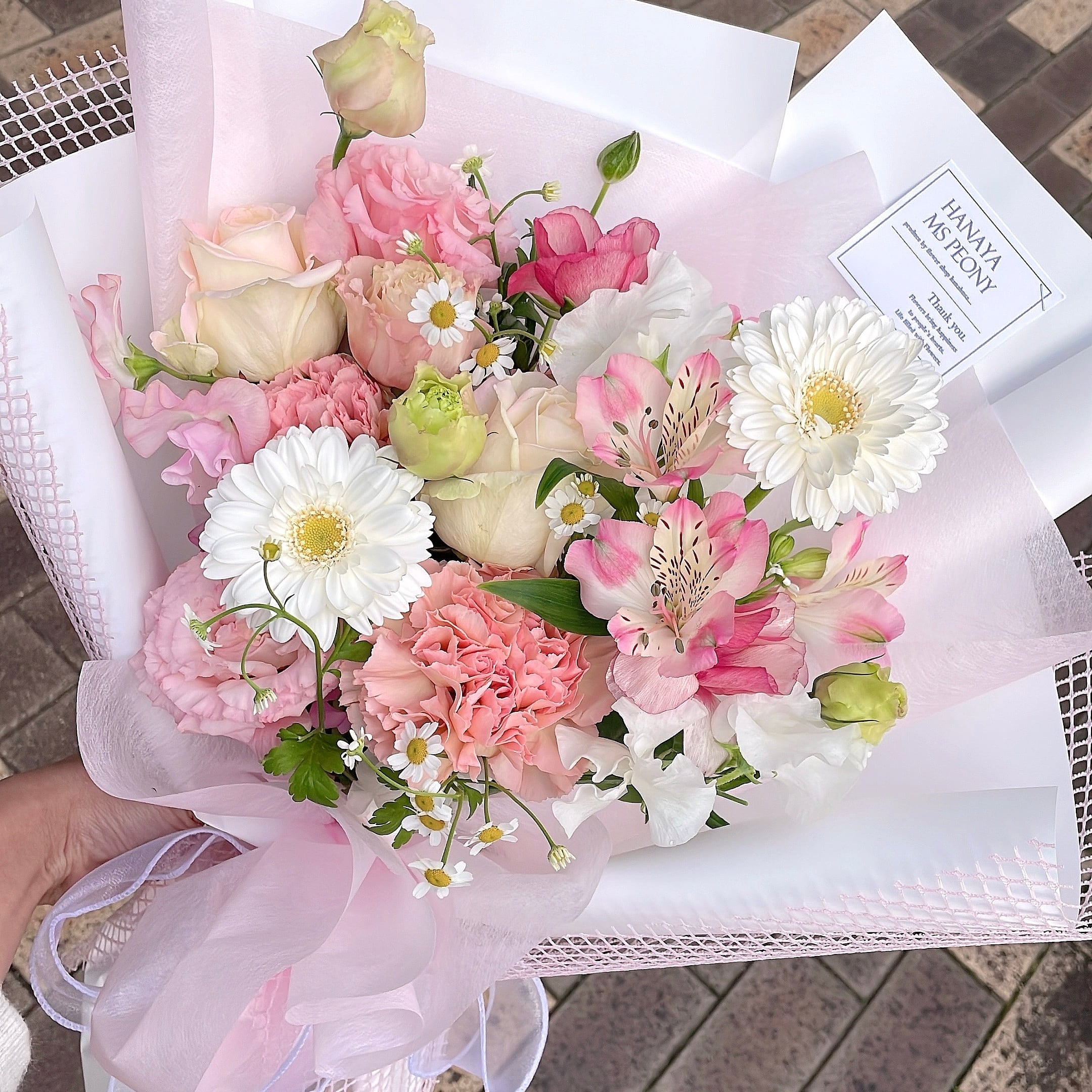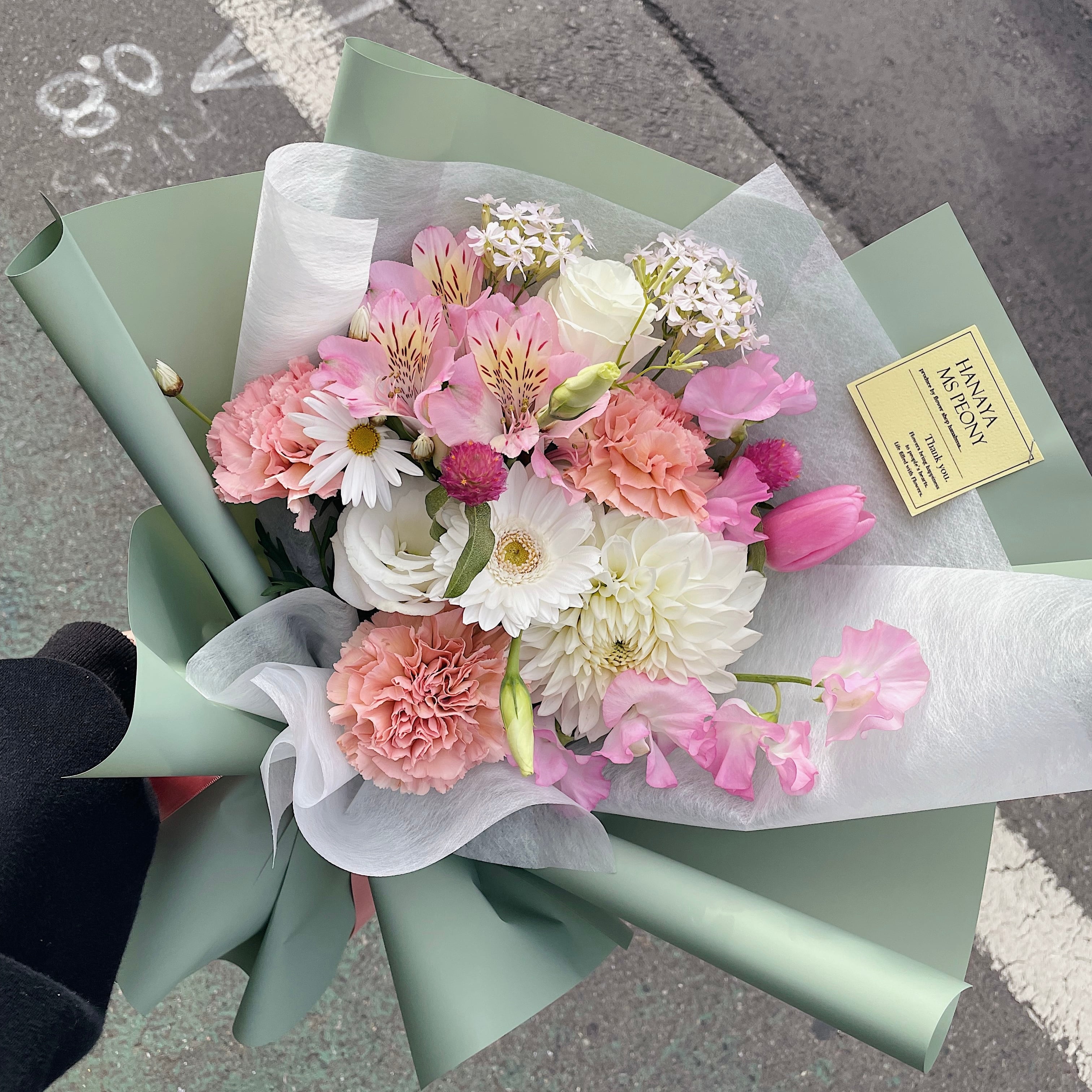 こちらの商品はお花とラッピングのお色味をお選びいただき、スタッフがそのとき仕入れたとびっきり可愛い季節のお花でお作りするMs Peonyオリジナル韓国花束となります♡