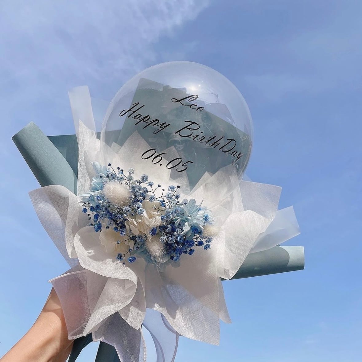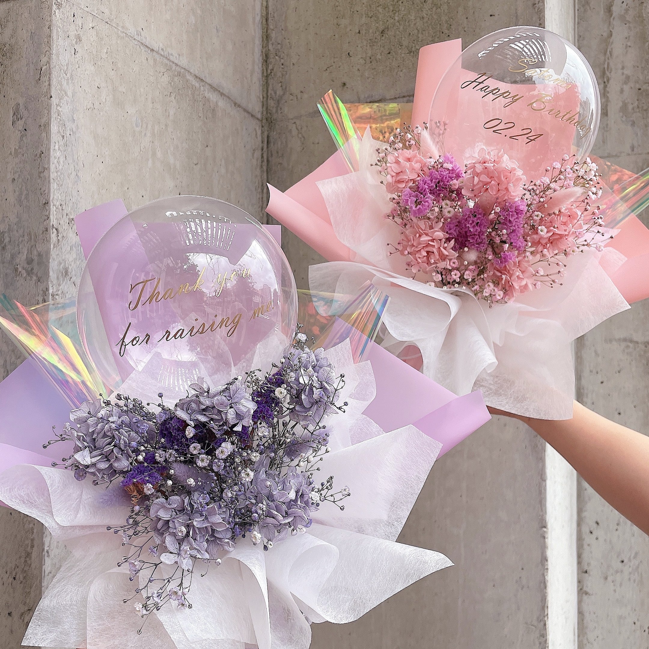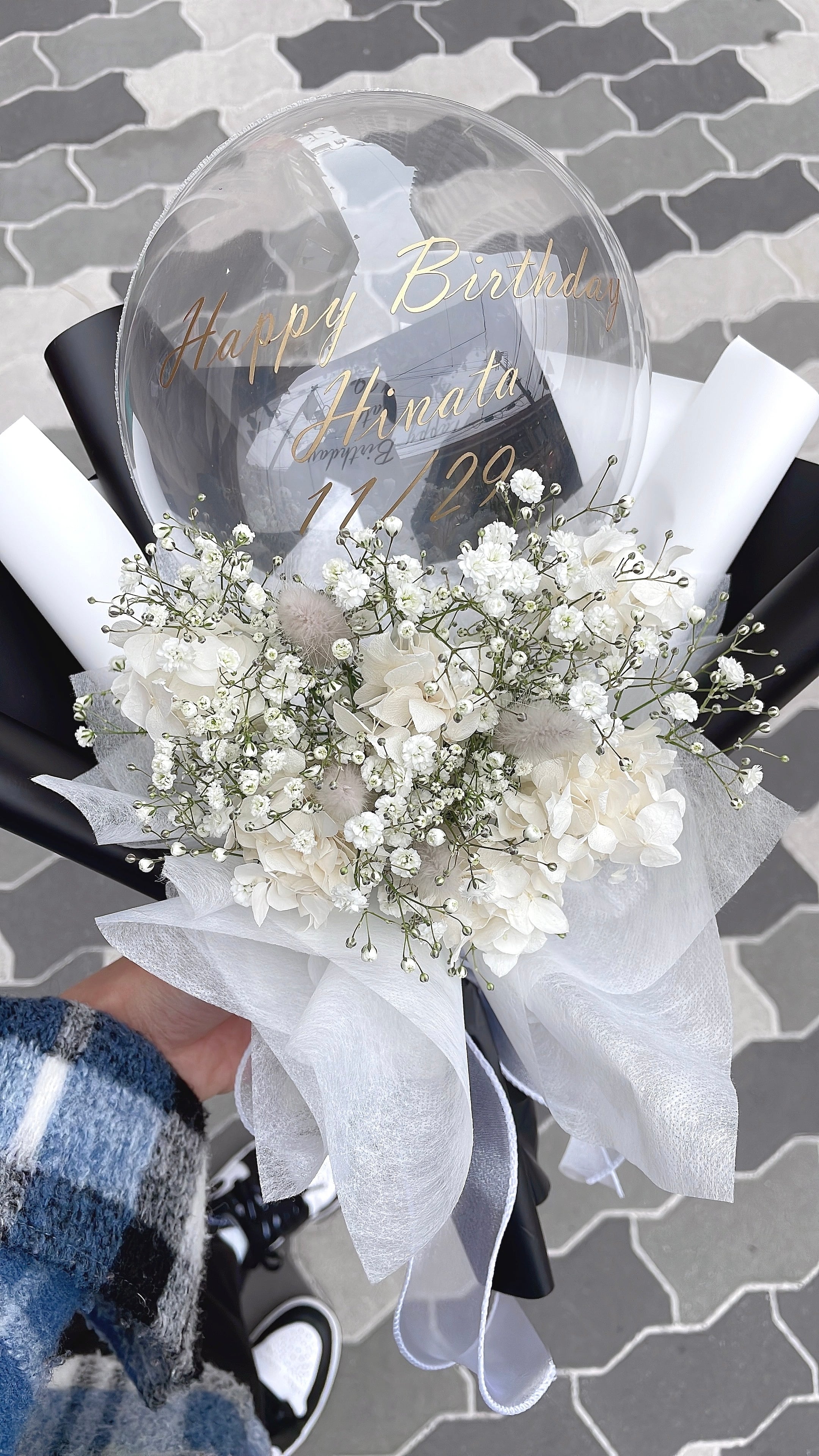 プリザーブドフラワーとドライフラワーを使用したバルーンブーケです。