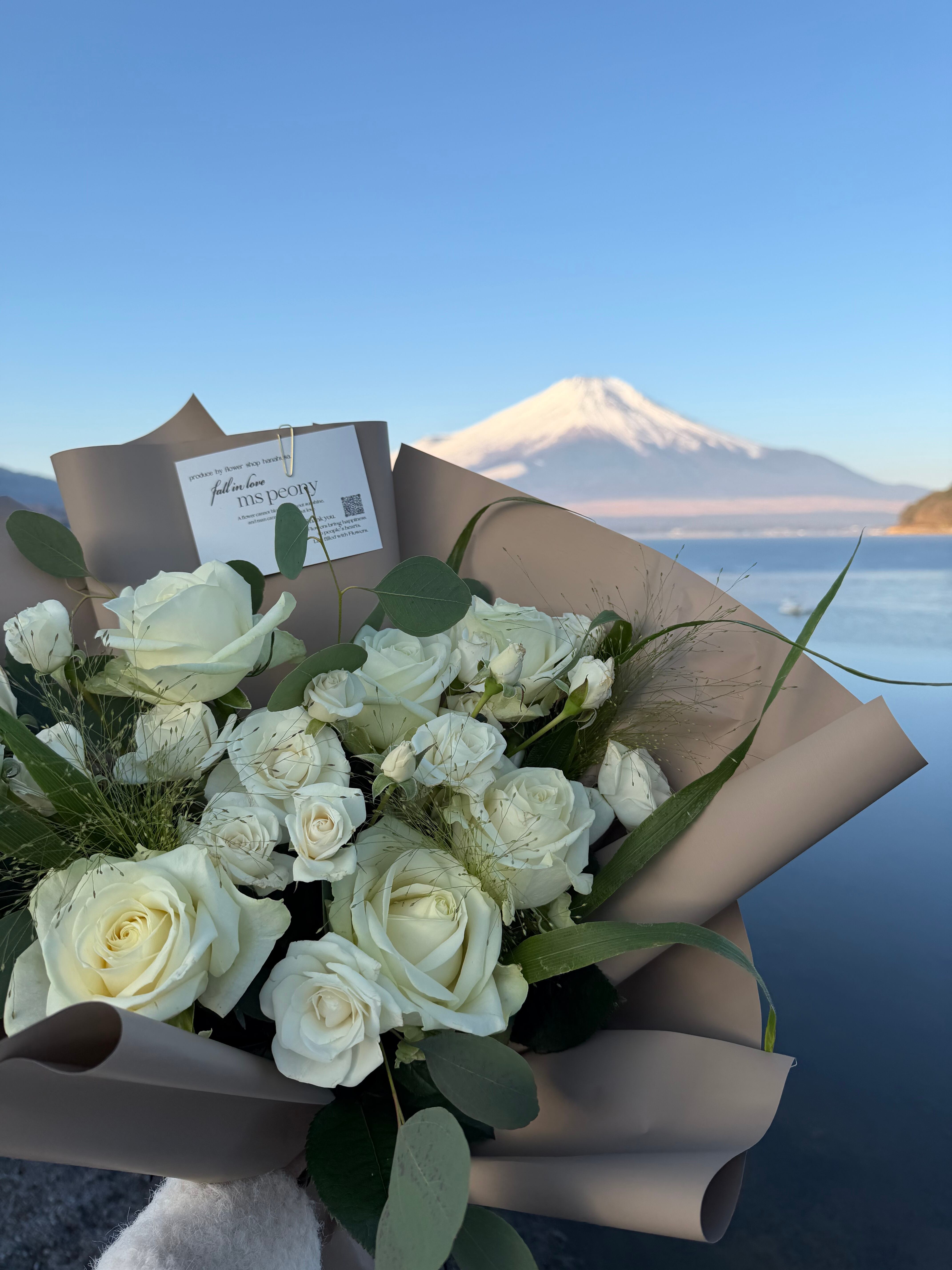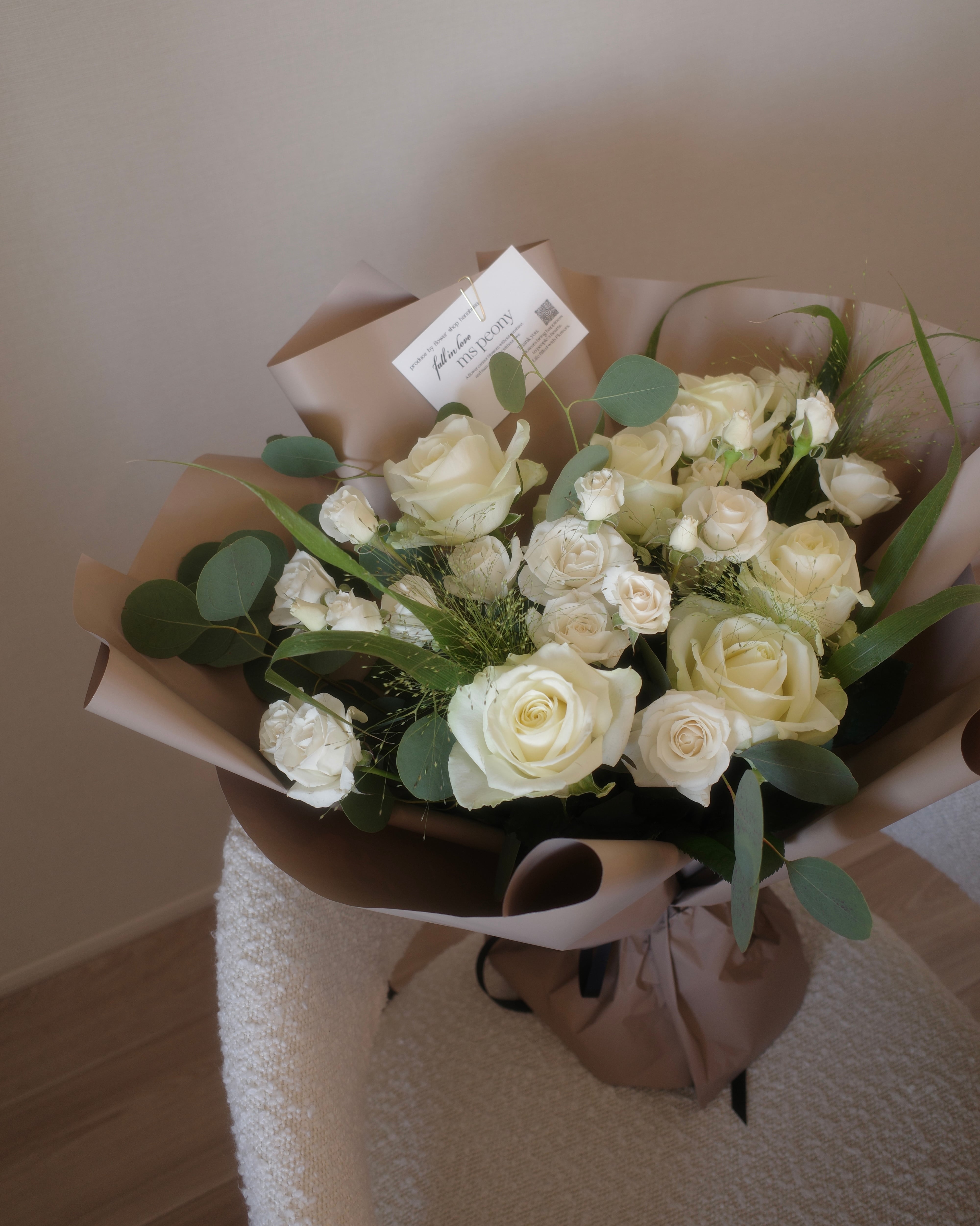 生花に特化したMs Peonyだからこそご用意できるバラとユーカリが盛りだくさんで