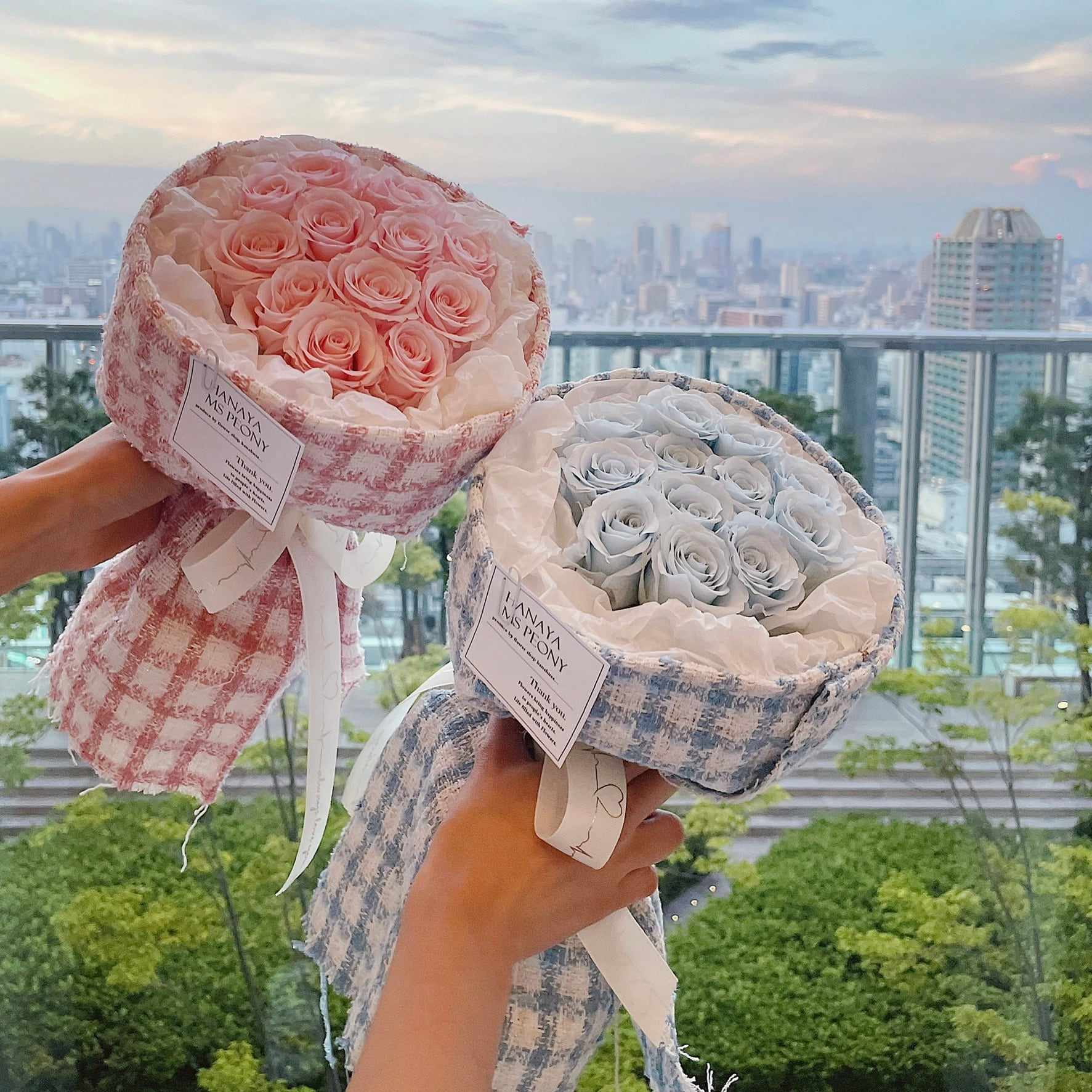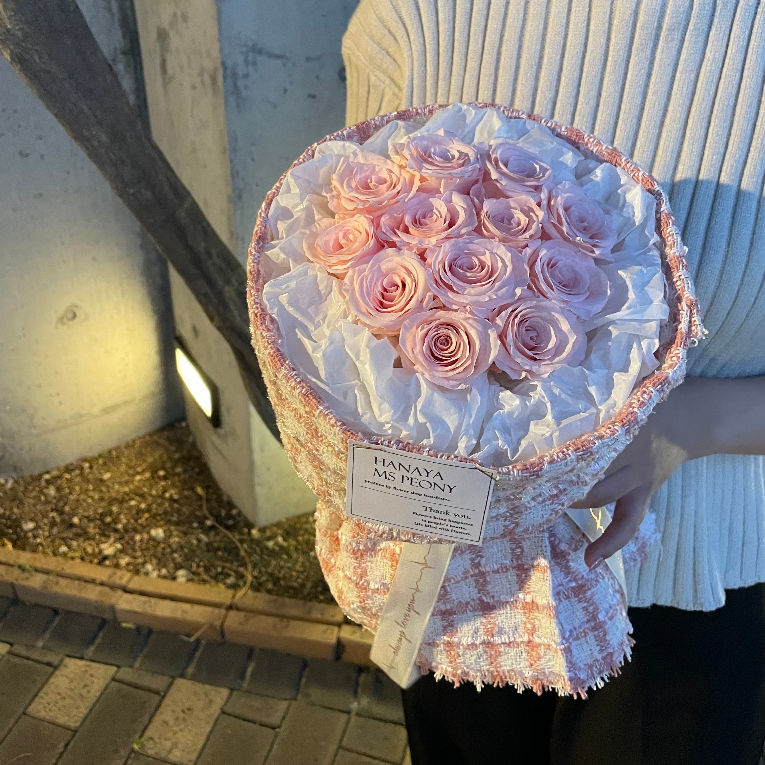 3年から5年ほど綺麗な状態で、枯れることのないと言われている高品質のプリザーブドフラワーを使用し、ツイードラッピングで仕上げたツイードワンホンブーケです♥