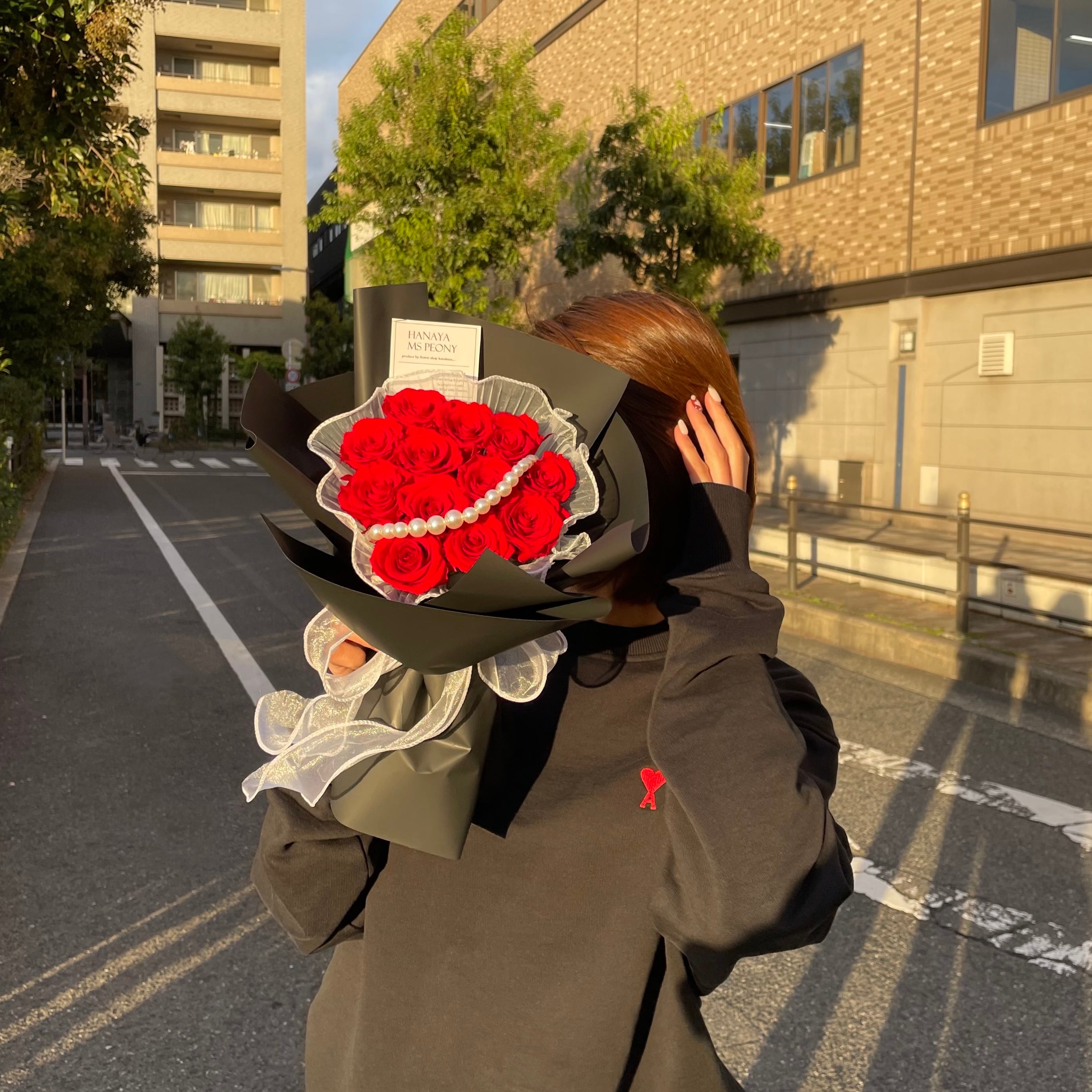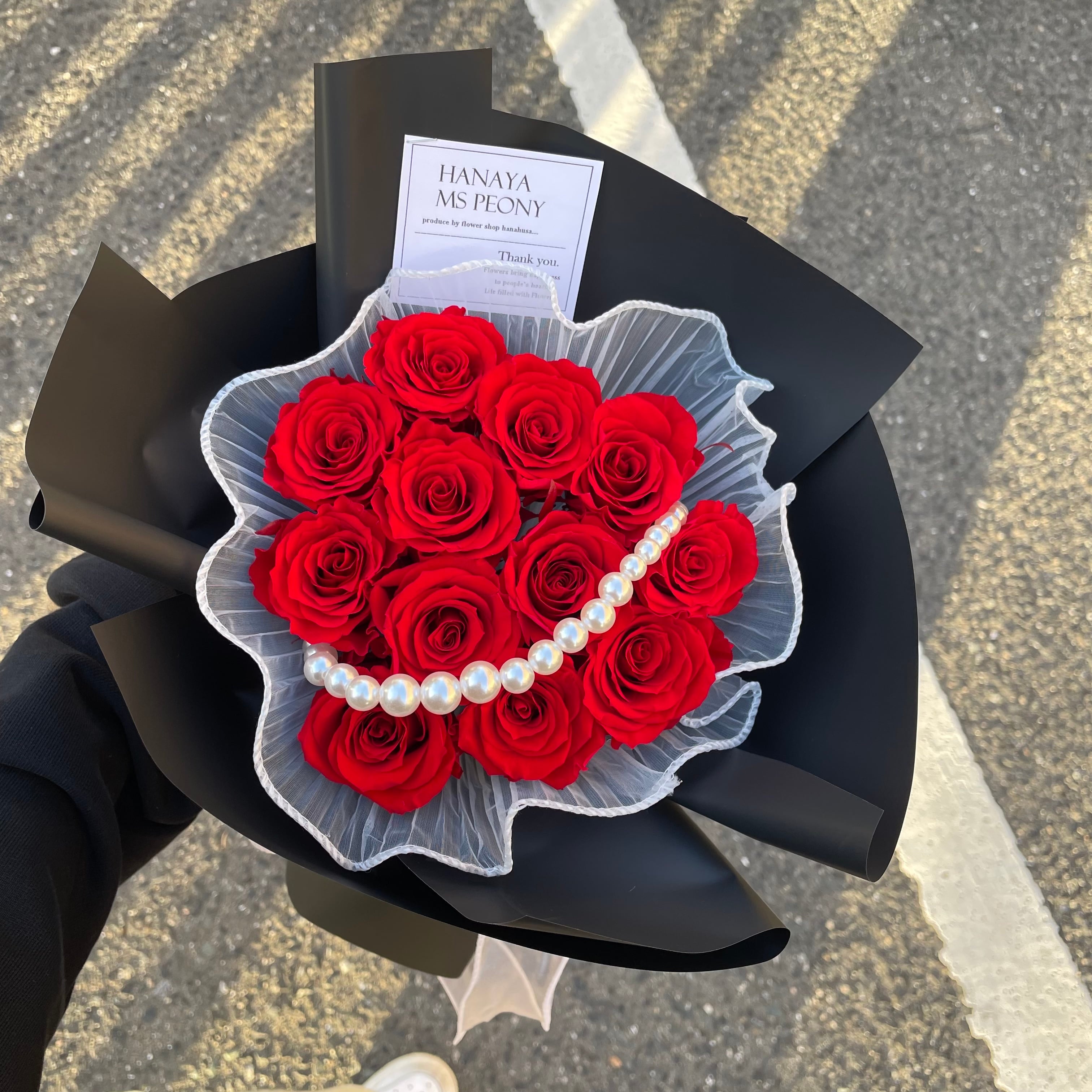 少し深めの赤色クイーンレッドというお色のプリザーブドフラワーにパールとレースを付けて、黒ラッピングとオーガンジーのリボンで仕上げたブーケになります♥