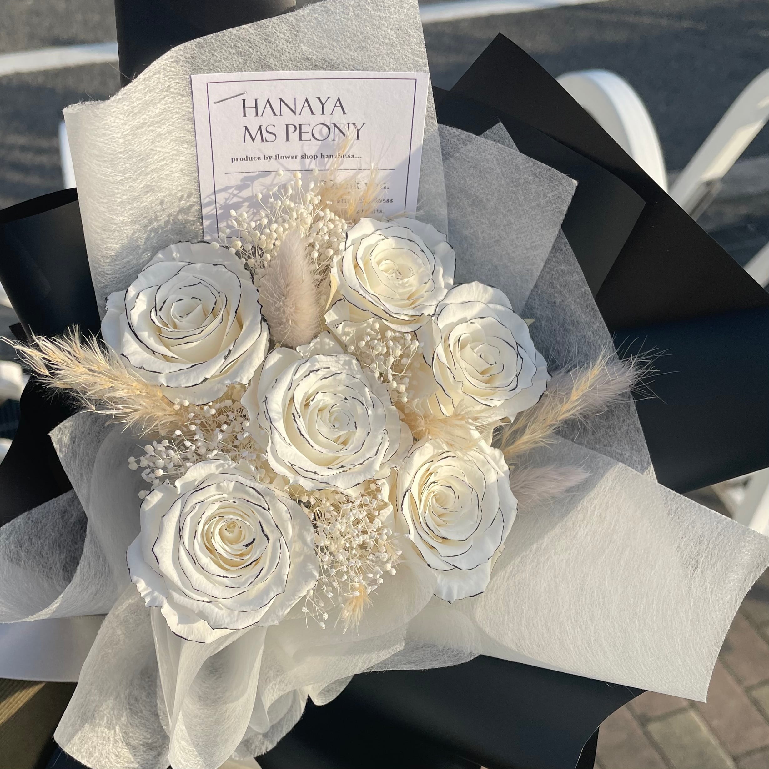 大人気のプリザーブドフラワーを特殊カラーリングしたモノトーンローズに、プリザーブドフラワーのラグラスとパンパスとかすみ草を入れたミニブーケです♡約27-30cm前後で小ぶりなサイズなので、プレゼントにも人気です!