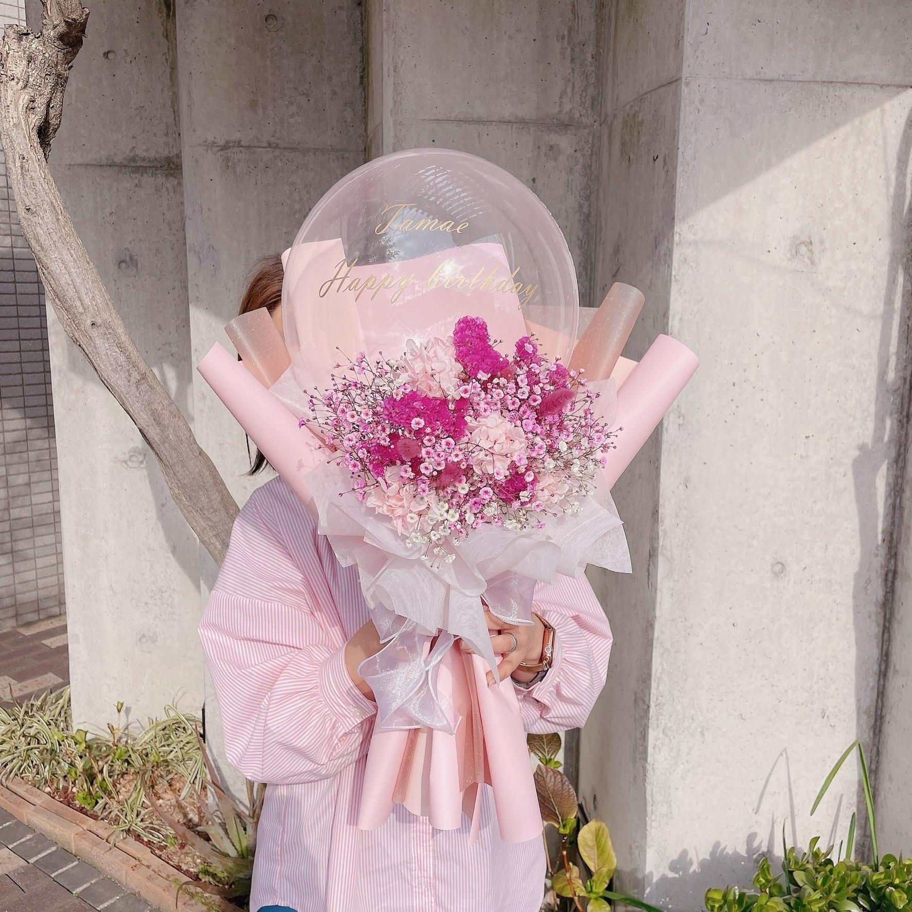 プリザーブドフラワーとドライフラワーを使用したバルーンブーケです。