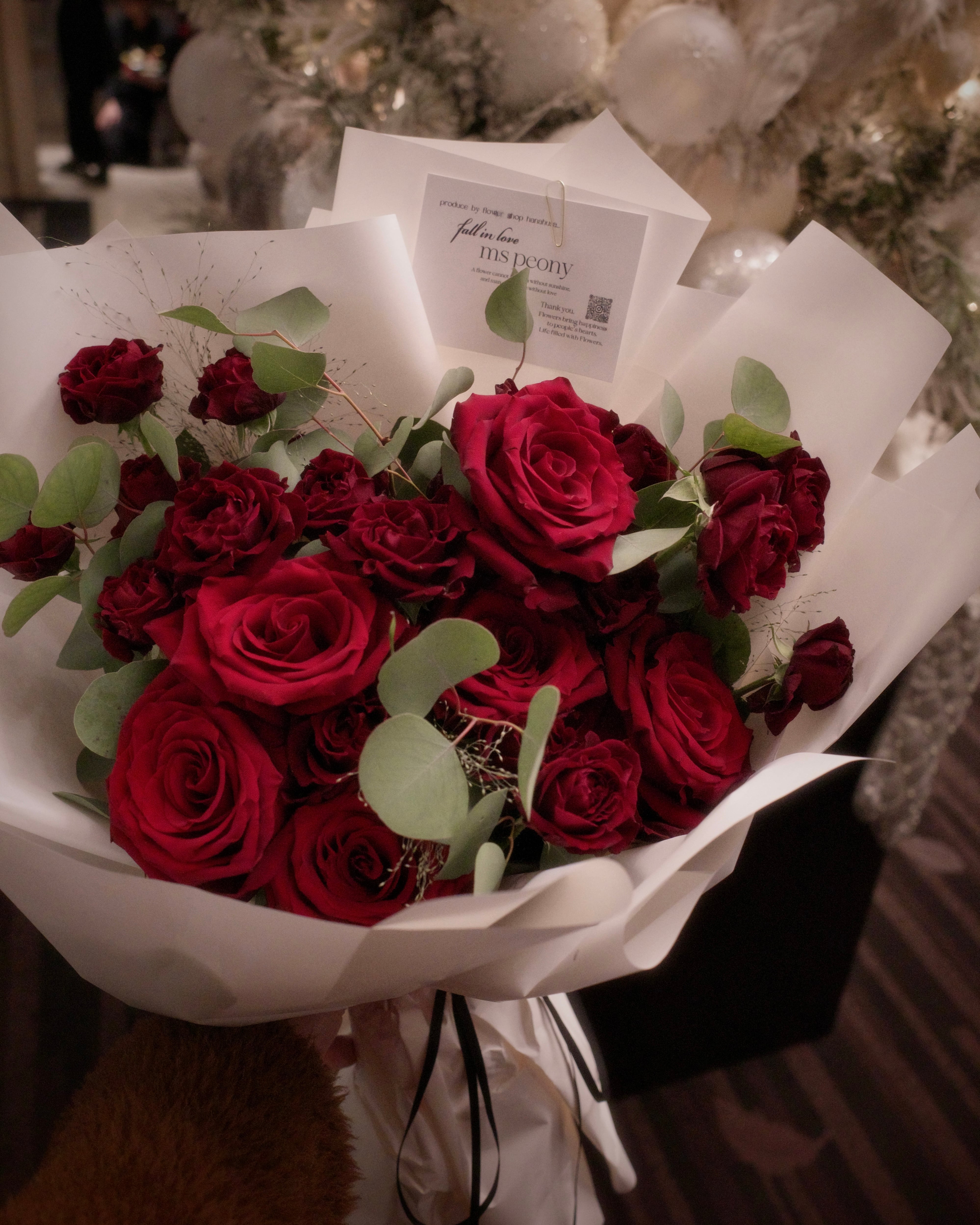 生花に特化したMs Peonyだからこそご用意できるバラとユーカリが盛りだくさんで